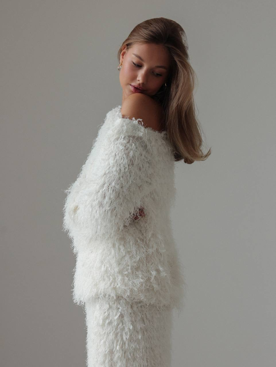 This midi skirt, crafted with a feather-textured fabric, brings elegance with a playful twist. The soft, fuzzy surface adds dimension to the design, while the flattering midi length makes it perfect for a variety of occasions, from casual outings to more formal gatherings. Wear it with a fitted top or an off-shoulder blouse to enhance its luxurious texture. This skirt promises comfort without compromising on style, ensuring you’ll stand out with every step.