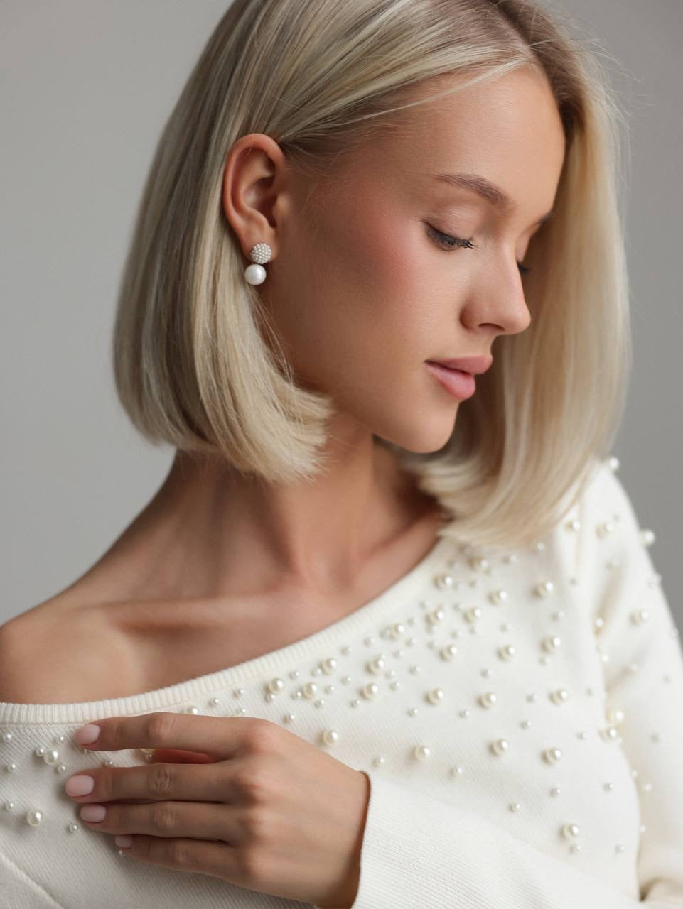 Add a touch of elegance to your wardrobe with this ivory sweater adorned with delicate pearl embellishments. The fine knit fabric provides a soft and cozy feel, while the pearls create a luxurious and feminine detail. Perfect for pairing with skirts, trousers, or jeans, this sweater is a versatile choice for formal dinners or casual outings. Effortless sophistication in every stitch!